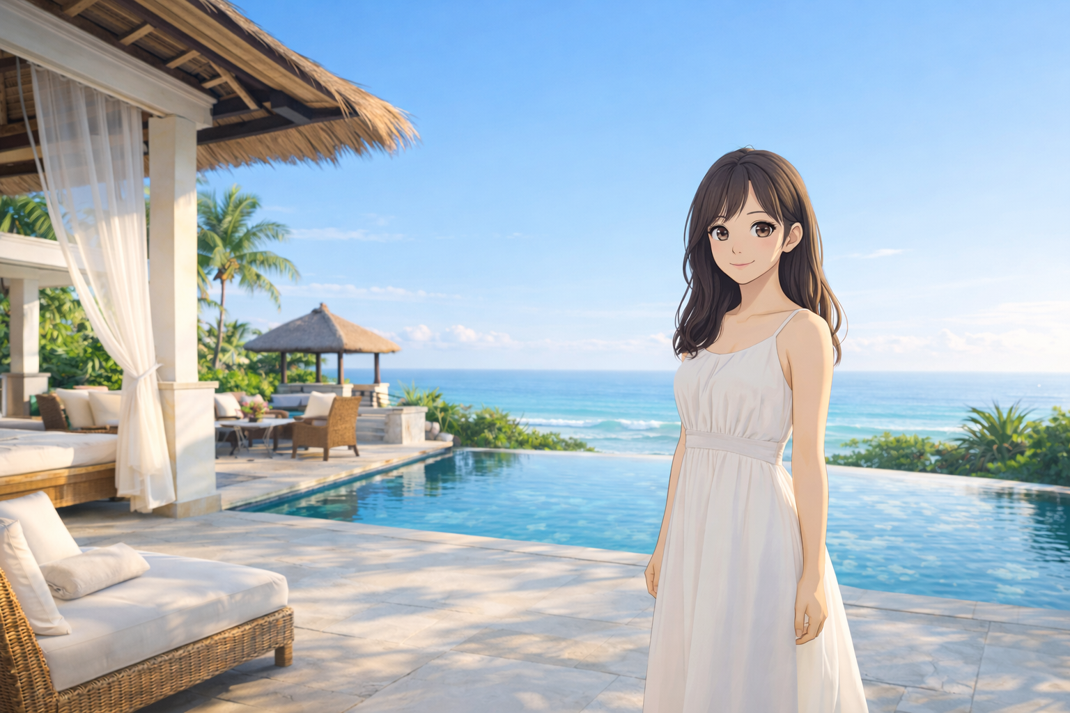 『a la mode』の大きな魅力として外せないのが、バリ島ロケならではの開放感です。南国のやわらかな光、海辺の爽やかな景色、上質なホテルの空間など、背景そのものが作品全体の雰囲気づくりに大きく関わっています。